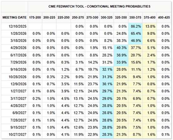 美联储降息预期明显升温,美联储12月降息或已成定局。由于近期美国就业市场数据疲软,多位联储官员公开支持降息,根据CME FedWatch工具,市场目前预计美联储在12月10日降息的可能性为86%。