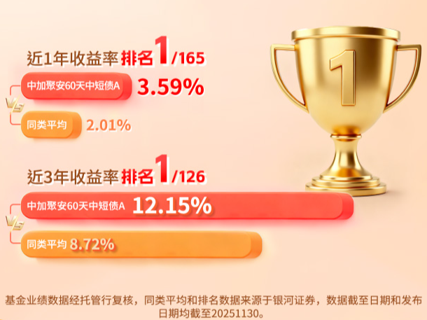 比如$中加聚安60天滚动持有中短债发起式A(OTCFUND|013351)$就是其中翘楚:截至11月30日,该基金A类近1年/3年分别以3.59%和12.15%的收益率在同类基金中排名第1,分别超越同期业绩比较基准3.94%和11.16%。
