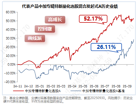 业绩注释:中加专精特新量化选股混合发起式A成立于2024年11月12日,风险等级为中风险,历任基金经理为林沐尘(2024.11.12-至今),成立至今净值增长率和业绩比较基准增长率分别为 52.17%(26.11%)。中加聚安60天滚动持有中短债发起式A成立于2022年6月13日,风险等级为中低风险,历任基金经理为闫沛贤(2022.6.13-2024.6.28)、魏泰源(2024.5.6-至今),成立至2022年末、2023-2024年度及2025年上半年及三季度净值增长率与业绩比较基准增长率分别为1.32%(0.01%)、4.61%(0.33%)、4.20%(1.27%)、1.56%(-0.74%)、0.40%(-0.31%)。基金业绩及比较基准数据来自中加基金产品定期报告,截至20250930。