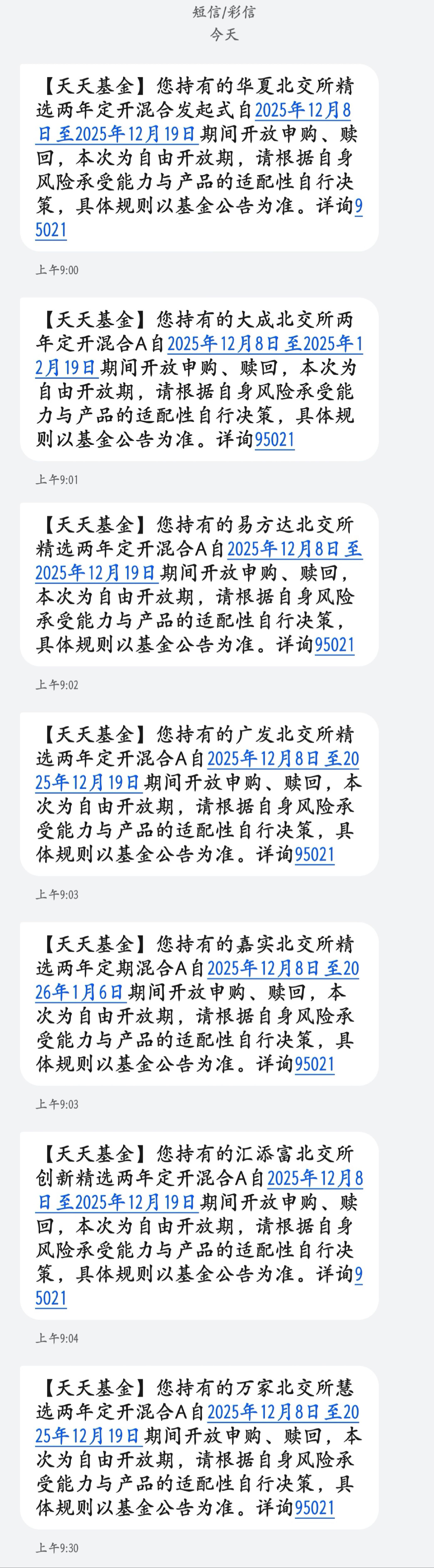 我是昨晚就提前申请赎回了(除了还在亏钱的嘉实基金),今早平台也都发了短信提醒(见附图)