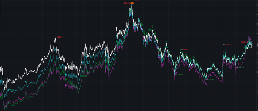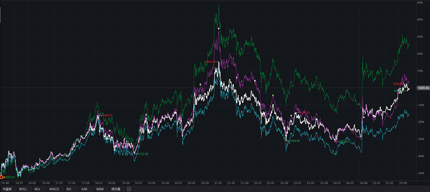 我们把对比的基点改成2021年的最高点,这样可以看出下跌过程中的情况,从而发现不同指数的波动情况。