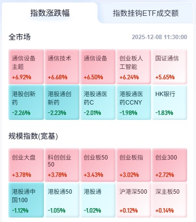 通信设备、通信技术、创业板AI等涨幅靠前,港股创新药、香港银行跌幅偏大。
