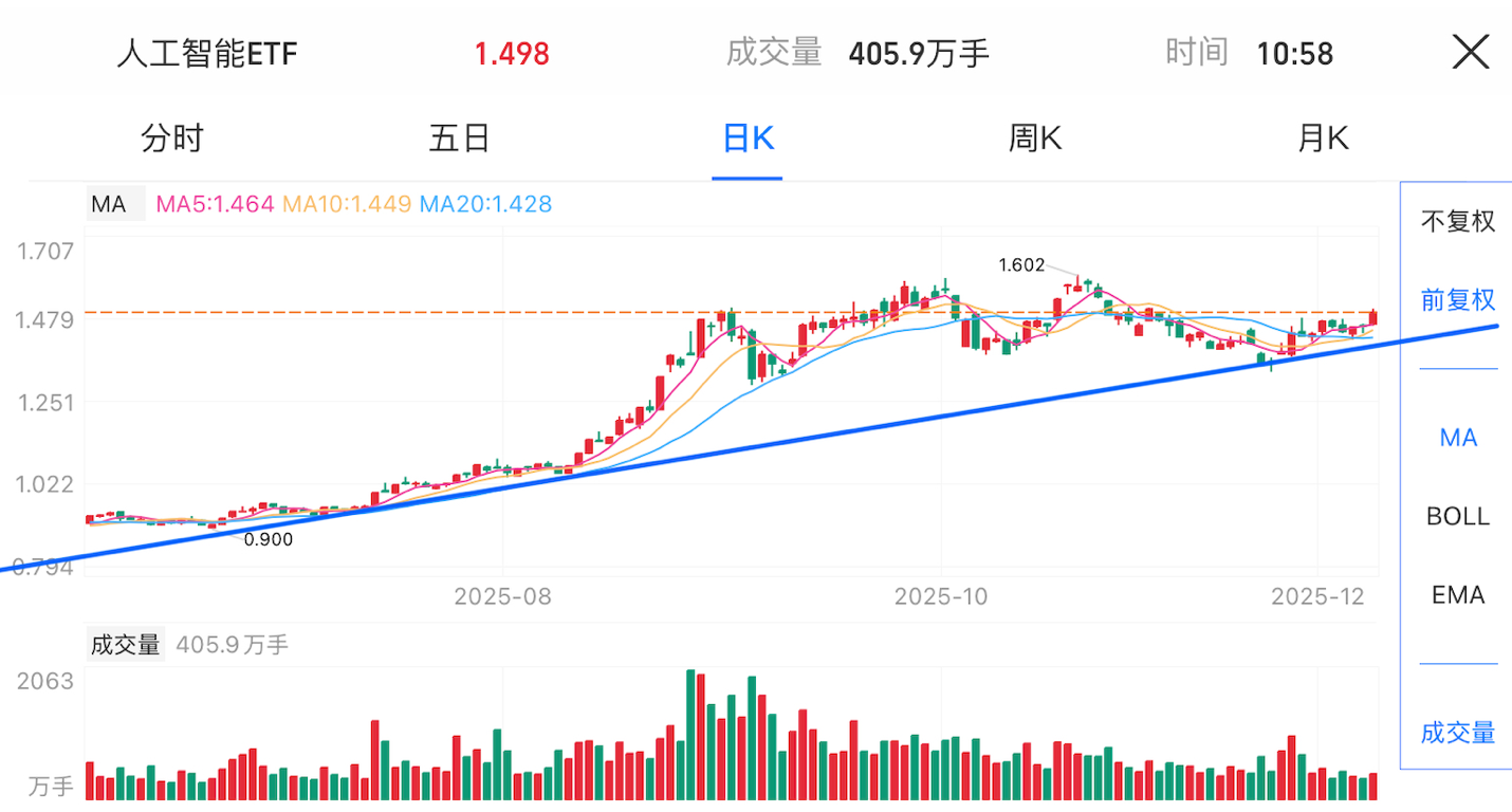 人工智能ETF一直沿着一条清晰的长期上升趋势线稳步攀升。近期,价格再次回踩并确认了这条趋势线的有效支撑,随后强势上攻。
