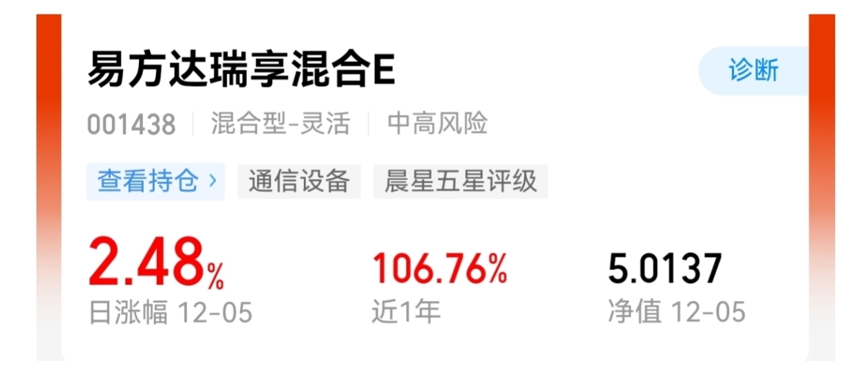 最近科技板块表现确实亮眼,今天又是靠科技股带动大盘上涨。我注意到易方达瑞享混合今天涨了6.6%,在CPO概念重新活跃的行情中表现突出。这只基金近半年涨幅接近90%,长期来看更是不错,成立以来累计收益达到4倍。随着AI应用场景越来越多,对算力的需求肯定会持续增长,相关的硬件设备建设也会加快。从历史表现看,这只基金在科技赛道确实比较有优势,我会继续关注它的表现。