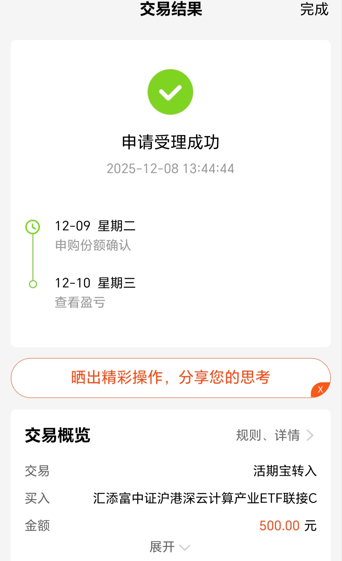 今日市场行情一片火热,A股三大指数集体上涨,创业板涨幅超3%,个股更是全面飘红,从盘面来看,科技赛道整体涨幅不错,其中AI应用和CPO板块带来领涨,特别是我持有的$汇添富中证沪港深云计算产业ETF联接C(OTCFUND|014544)$目前实时估值大涨3.3%,即将收获一波三连涨行情,目前我的持有收益率也有6.58%,近一年涨幅超62.25%,业绩远超同类平均!