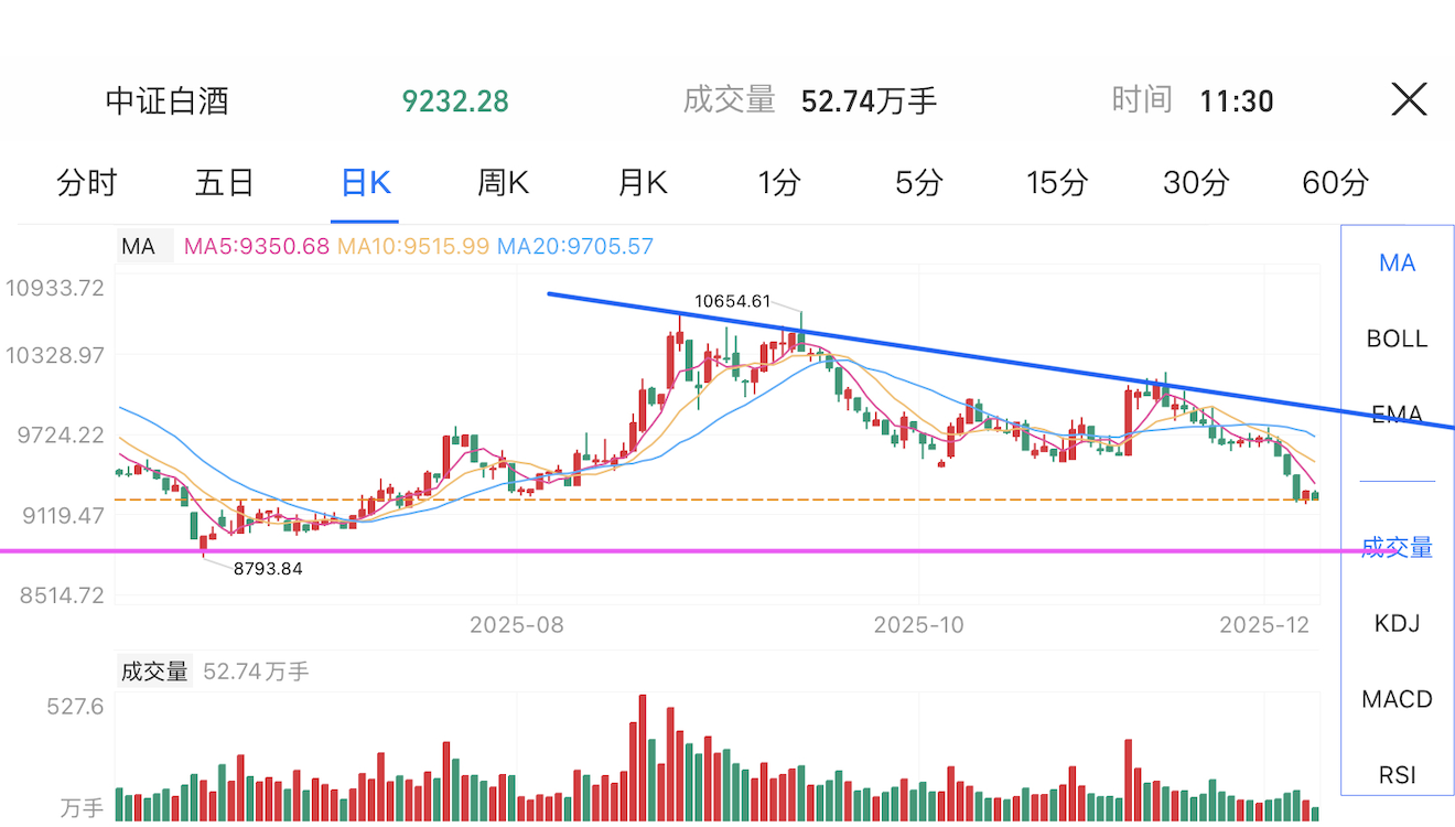 白酒持续在底部区间缩量震荡,指数受到清晰的下降趋势线压制,价格处于所有关键均线下方,走势偏弱。需有效突破下降趋势线和短期均线压制,才能扭转偏弱的格局。若关键支撑位失守,需警惕陷入更深回调的风险。
