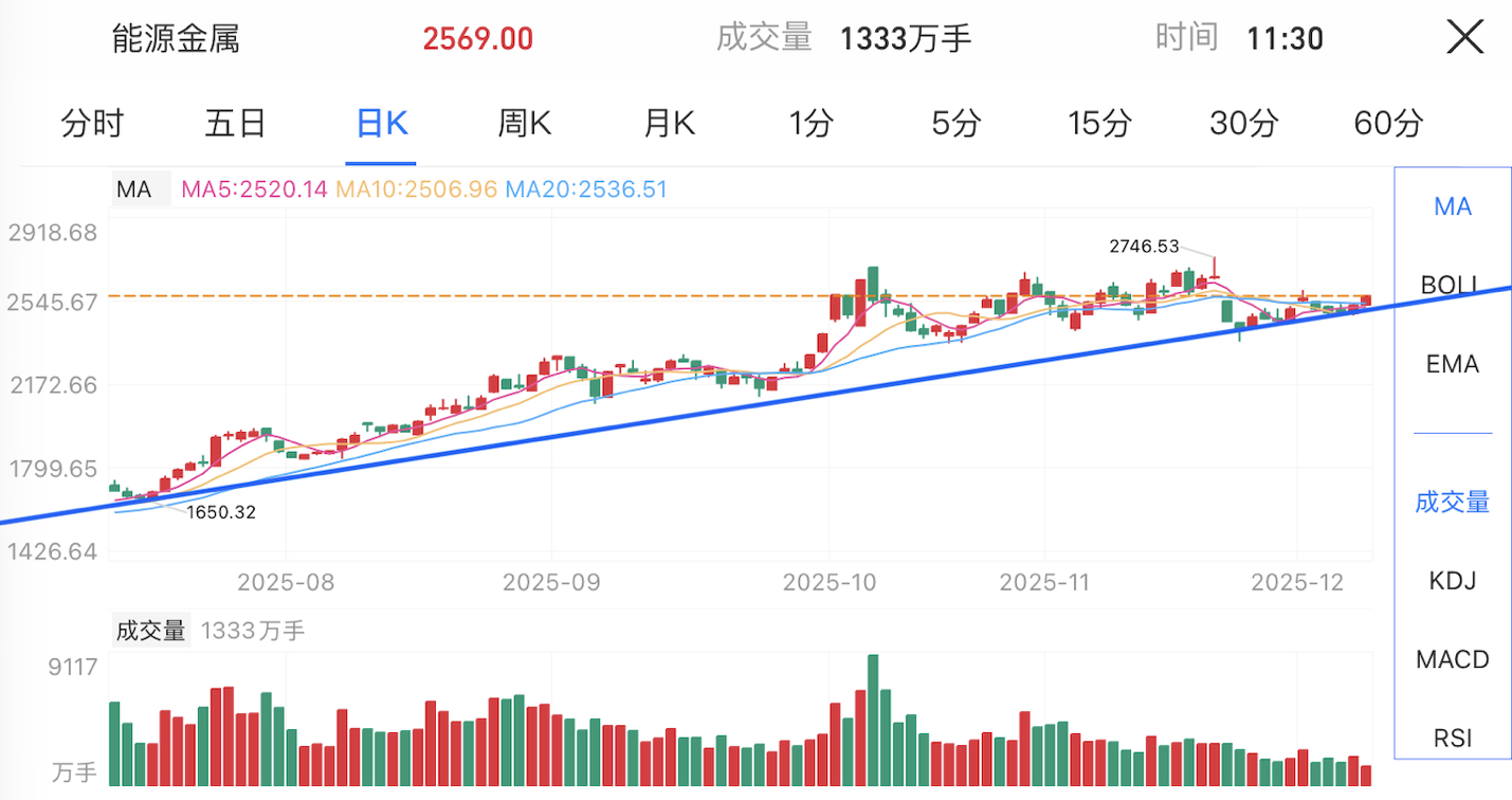 能源金属仍处于长期上升通道内,但近期回调至前低支撑区域。出现止跌迹象,但成交量能不足,市场情绪谨慎。 资金流入是关键。若缺乏资金,预计将维持弱势震荡,窄幅波动于关键支撑位附近,以等待基本面或资金面的催化。