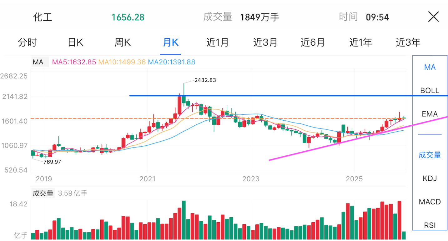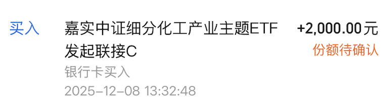 今日加仓2000。化工板块短期沿趋势线多次获得支撑,目前最高点还有较大上行空间。临近年底资金面不稳,机构普遍倾向锁定收益、压降波动,在这种环境下,化工作为典型的稳健板块而更受青睐。同时,制造业回暖、原油企稳,使化工产业链的盈利预期逐步改善,周期修复逻辑不断加强。同时在“反内卷”趋势下,化工龙头依靠规模与成本优势更具竞争力。该基金紧跟指数、覆盖细分龙头、费率低,具备良好的跟踪效率与中长期配置价值。本人持续定投中。