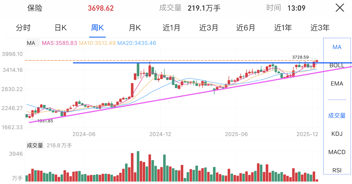 保险长期上升通道内运行,技术面强势,价格在所有关键均线上方。目前正逼近并挑战前高压力位。能否突破压力位是关键。若成功站稳,将打开新一轮上涨空间;若冲击失败,预计将回踩均线或长期趋势线寻求支撑。