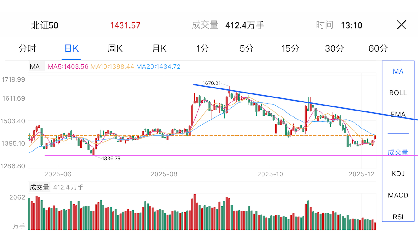 北证50 底部企稳反弹,受资金活跃驱动,低市值、高成长性标的成为热点。目前处于回调趋势中,并受下降趋势线压制。短期预计维持活跃度,但走势取决于能否有效突破下降趋势线压制。由于高波动性,需谨慎控制风险。