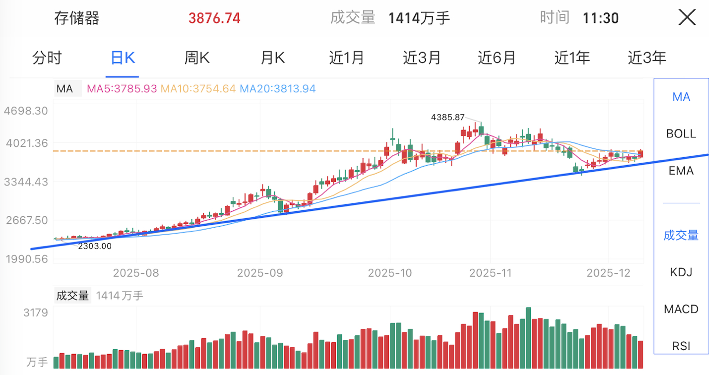 存储芯片 中长期上升趋势。经历强势上涨后,短期进入高位巩固或轻微回调。板块持续强势,资金介入迹象增强。目前挑战上方压力位是关键,若能放量突破前期高点,有望确认新一轮上行;否则,可能转为高位震荡整理,消化前期涨幅。