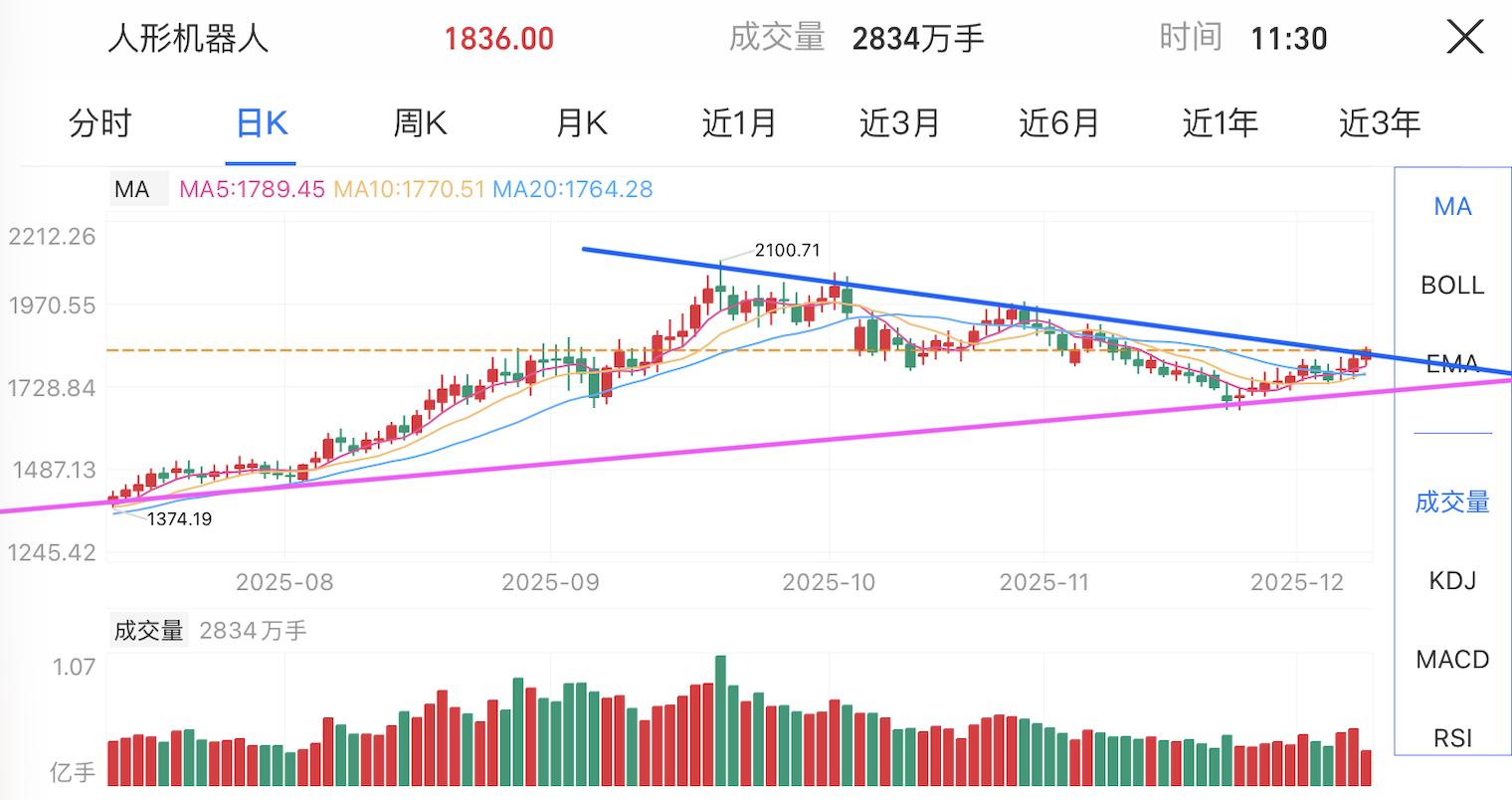 人形机器人长期处于清晰上升通道内。短期进入三角形态整理,价格在均线上方,多头力量仍占主导。突破收敛形态上沿是明确打开上行空间的关键。若突破失败,则需警惕回踩长期趋势线的风险。