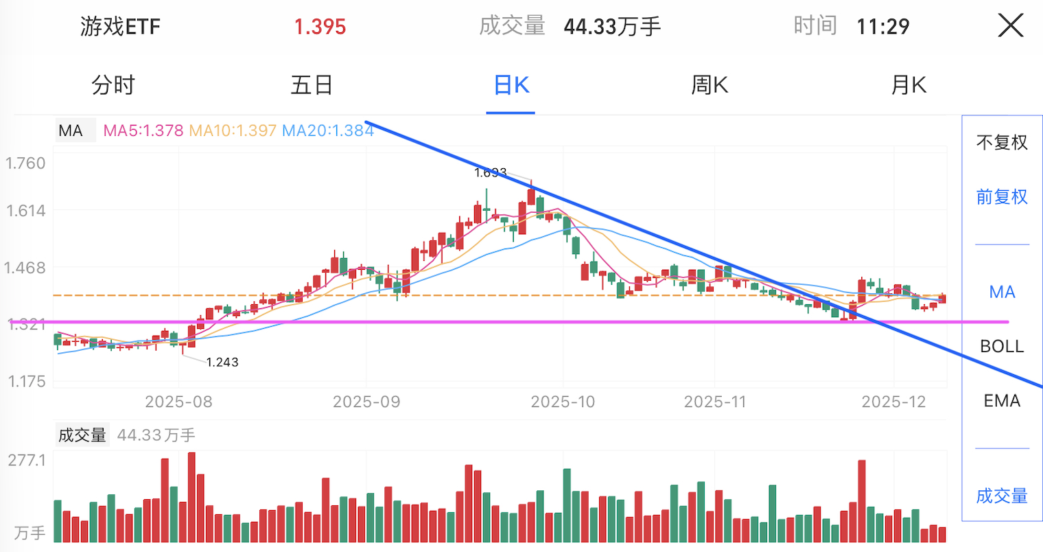 游戏目前底部整理,短期受下降趋势线压制震荡走弱。关键在于能否有效突破下降趋势线的压制。若突破成功,将打开上行空间;否则,预计继续在底部区间缩量震荡,静待新的催化因素。
