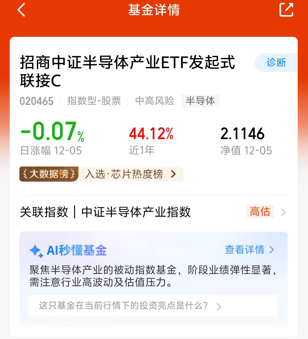 大盘今天表现还不错,继续上涨,三大指数整体涨了不少,半导体板块今天涨幅超2%,$招商中证半导体产业ETF发起式联接C(OTCFUND|020465)$目前预估涨幅2.59%,近六个月涨了47.89%,半导体板块长期来看发展前景很不错,长期看好这个方向,我准备分批布局了!