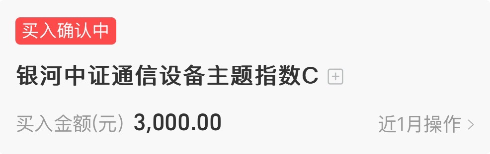 小皮我今日买入3000元银河中证通信设备啦$银河中证通信设备主题指数发起式C$ ,这只属于行业基金,这笔操作,简直是精准踩在了我心心念念的产业节奏上!太红火了!它作为通信设备指数,直接蹭到了光模块和算力硬件。现在光模块和CPO领域的持续火热,特别是在AI算力需求带动下,相关个股涨幅明显,推动了整个板块上涨。虽然最近市场整体上蹿下跳,但通信设备板块依旧硬气!需求强劲,高景气度肉眼可见,这就是我敢于在波动中布局的底气!近6个月91.44%的收益率,今天的涨幅让我对后续走势更加有信心,小皮今天上车一笔!