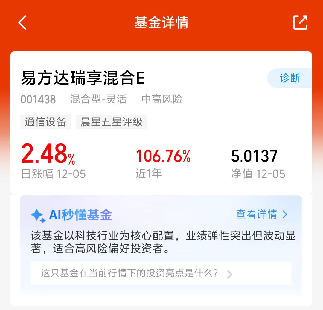 大盘近期表现还不错,今天继续上涨,三大指数集体大涨,科技、新能源等板块表现还不错,CPO板块今天大涨!易方达瑞享混合E持仓聚焦CPO板块,近六个月涨了89.89%,近一年涨了106.76%,经理调仓能力还不错,成立10年里紧密把控成长机会,成立以来涨幅507.78%,看好这个方向,我准备分批布局!