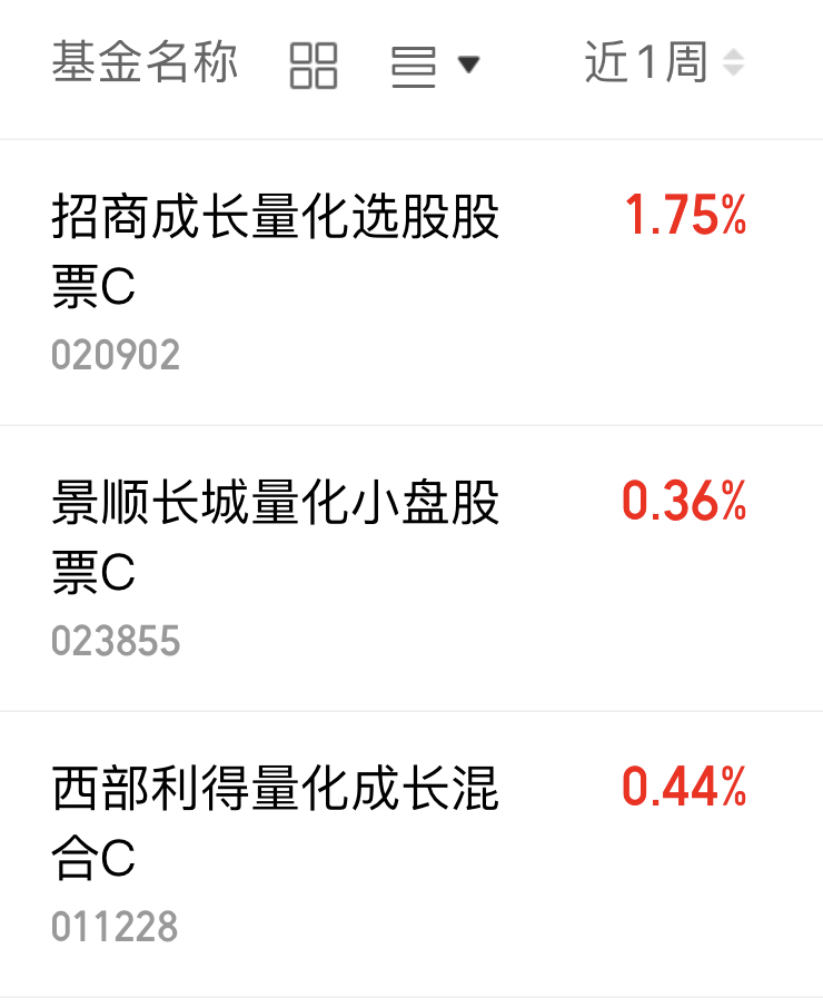 今天大盘涨势稳,个股大面积飘红。量化基金在近期行情里表现突出,跟上了这波上涨节奏,下面看看它近一周的具体涨势: