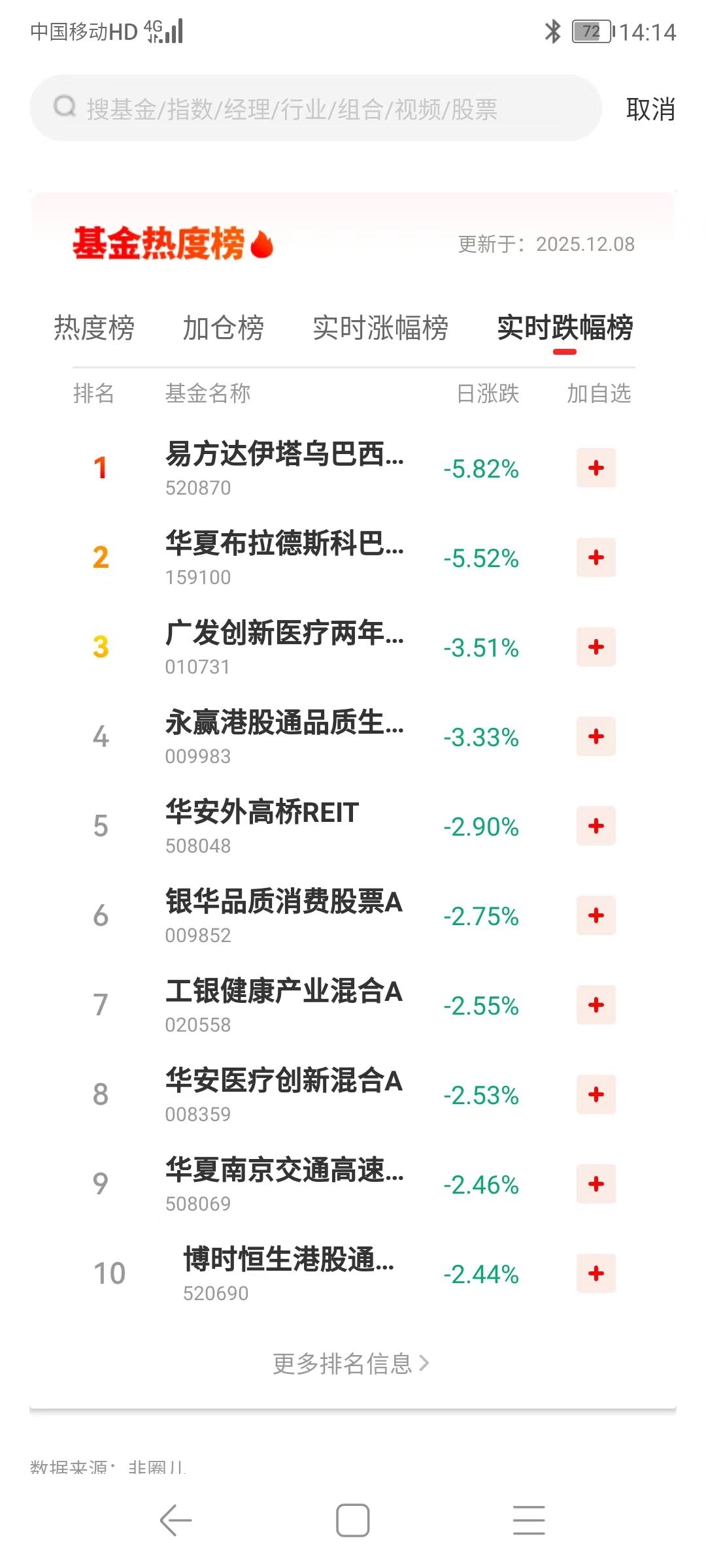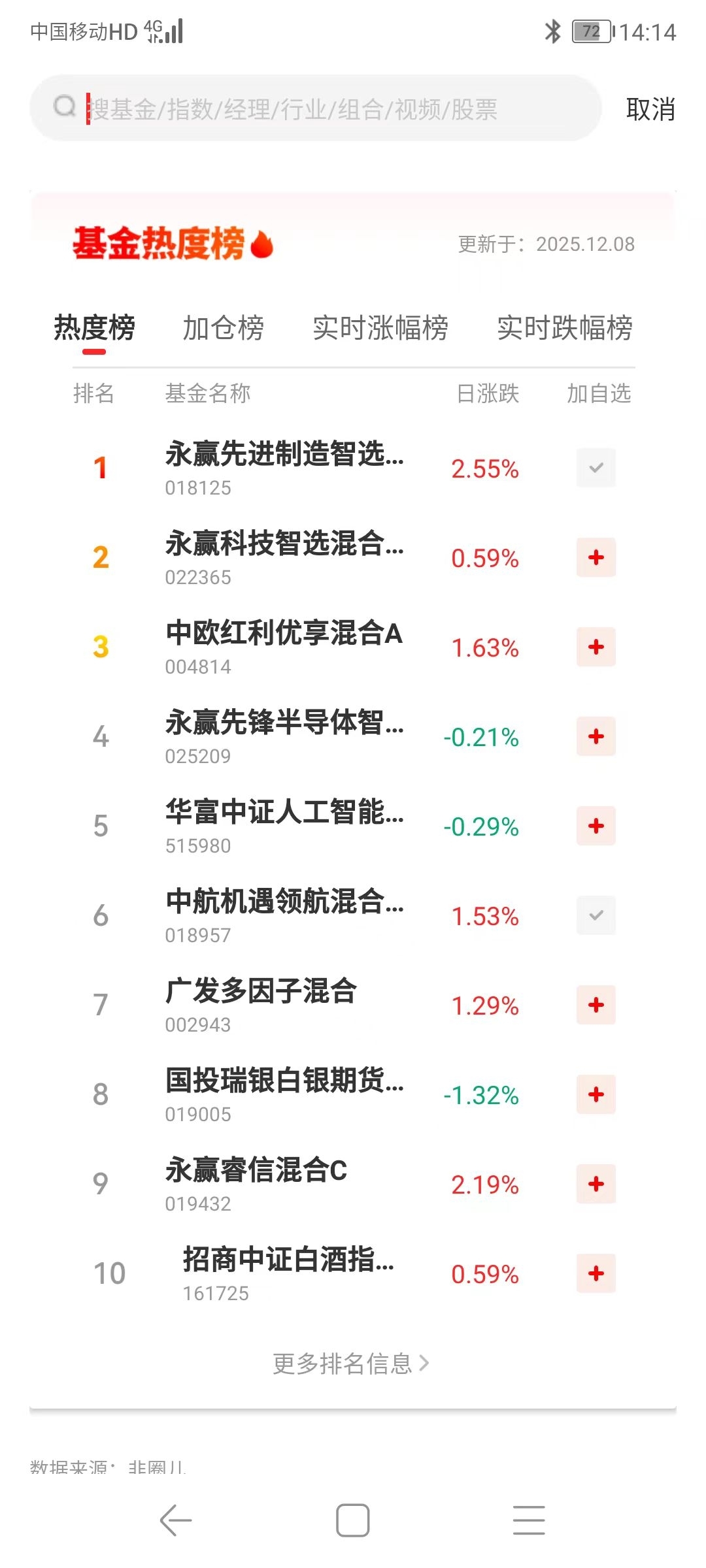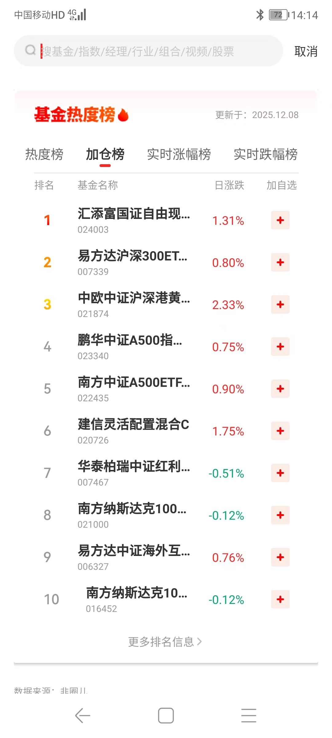 12月8日基金热度榜,加仓榜,实时涨跌幅榜