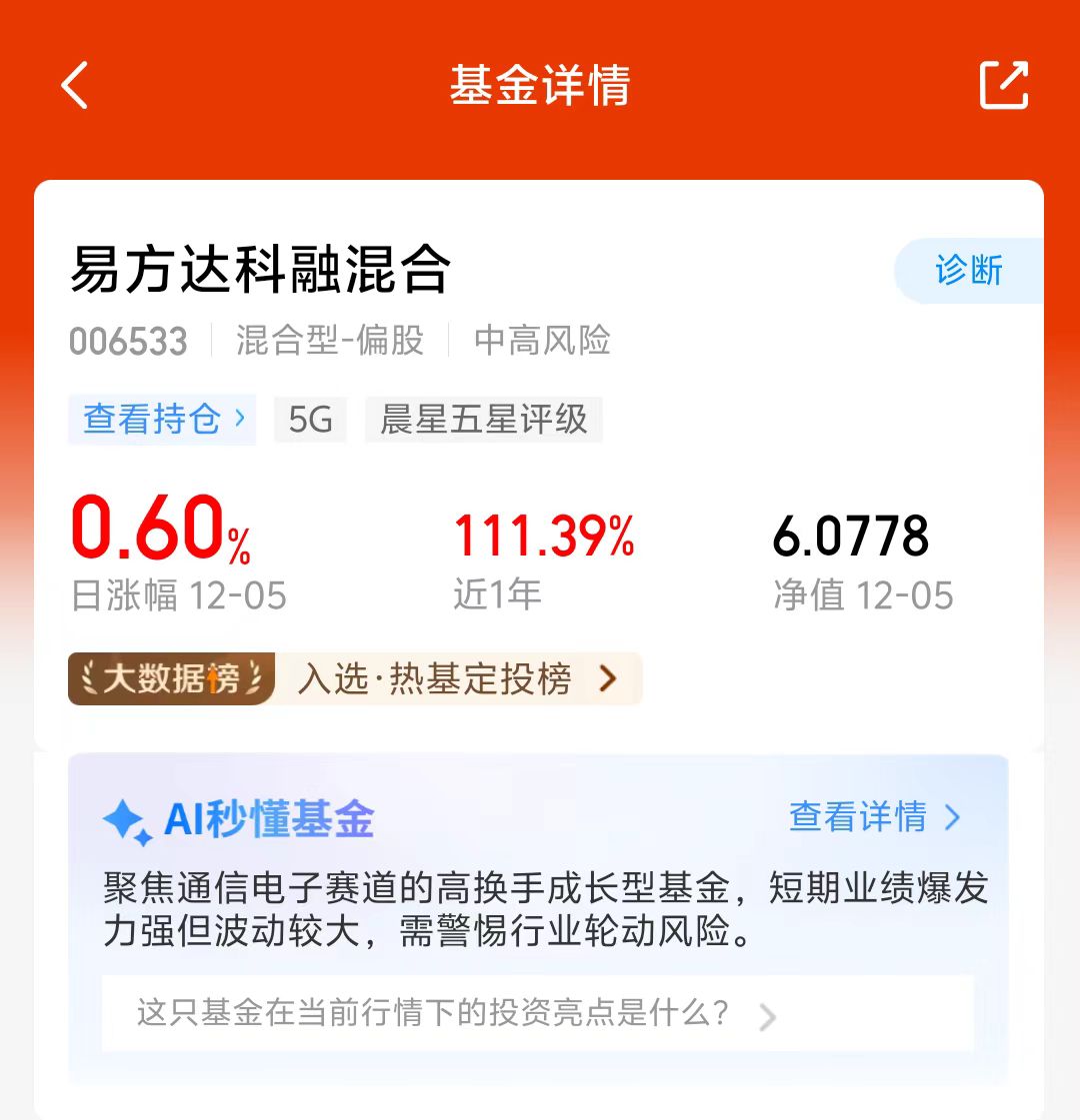 大盘表现还不错,今天继续上涨,成长行情下各大板块轮动速度很快,易方达科融混合持仓有科技、新能源和军工等板块,轮动配置,近六个月涨了98.58%,近一年涨了111.39%,成立以来涨幅超500%,太给力了,相信经理调仓能力,我准备分批布局!