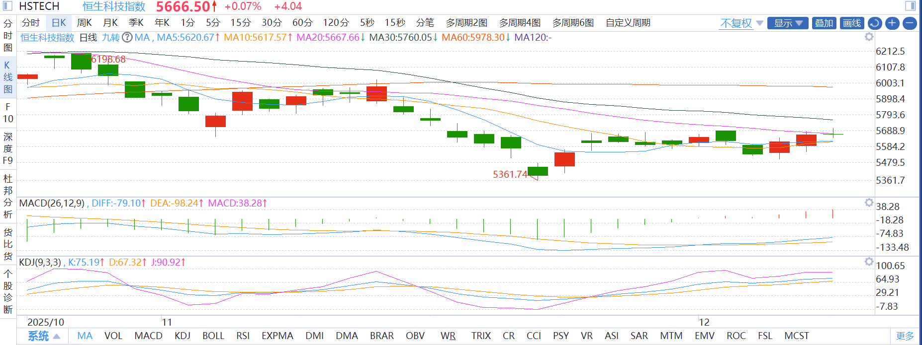 恒生科技:虽然今天恒生科技小幅跌了0.24%,但麦爸一点不担心!这不,午后也翻红了,一方面有A股AI、算力板块的强势联动,另一方面美联储12月降息落地,流动性红利要来了。技术面上,日线重返5日、10日线,MACD金叉红柱越变越大,周线KDJ三线向上交叉就在眼前,短期反弹动能在积累。麦爸认为,向上趋势没变,继续持仓看涨!