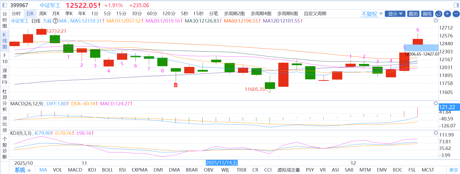 商业航天+军工:马斯克的“月球AI工厂”设想直接带飞商业航天,今天“航天系”个股涨停潮,还带动军工板块整体走强。技术面上,军工周线震荡上行,日线量能温和放大,均线形成强力支撑,形态非常健康。麦爸认为,商业航天赛道前景广阔,军工板块跟着沾光,后续还有想象空间,麦爸选择持仓看涨。
