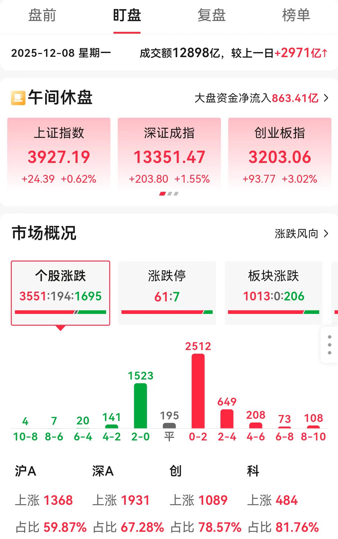 今天这盘面简直燃到飞起!压抑小半个月的市场,终于迎来“史诗级反弹”——截止午盘1.3万亿量能直接炸场,A股三大指数集体高开高走,创业板指狂拉3.02%站上3200点,这波行情谁看了不说一句“科技牛回来了”!