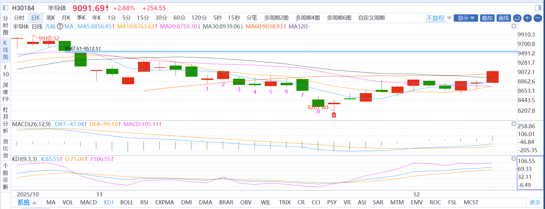 半导体板块:半导体今天一根中阳线直接突破60日线,成交额还放大了30%,这力度没话说!消息面上,摩尔线程登陆科创板市值破2800亿,DeepSeek-V3.2模型发布提振开源生态,AI算力需求一直在给半导体产业链“添火”,国产替代的长期逻辑没变,现在技术面也形成突破,麦爸持仓看涨!