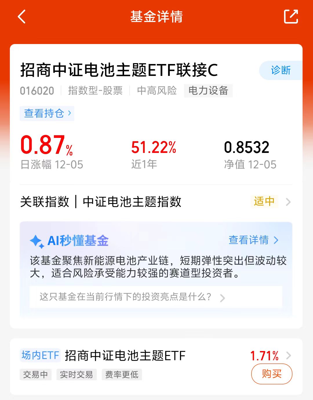 大盘今天继续上涨,科技等板块表现不错,电池今天也涨了不少呢!$招商中证电池主题ETF联接C(OTCFUND|016020)$目前预估涨幅1.71%,近六个月涨了65.51%,业绩还不错,电池板块长期来看发展空间还很大,看好这个方向,我准备继续分批布局了!