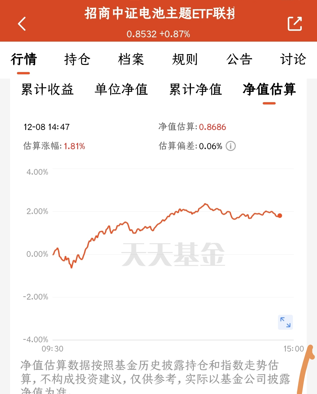今天市场整体向好,科技与新能源板块表现尤为活跃。我关注的$招商中证电池主题ETF联接C(OTCFUND|016020)$今日预估上涨1.81%,近半年累计涨幅达65.51%,表现相当出色。在我看来,新能源行业特别是电池领域具备长远潜力,未来发展空间广阔。当前我已持有该基金,并计划后续逢低逐步加仓。虽然短期可能面临波动,但着眼长期,这一方向依然值得持续配置与持有。