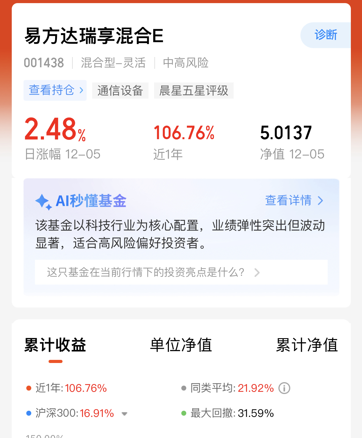 大盘延续回暖,创业板指涨超2%,CPO赛道领涨,现在是牛市中段但热点轮动难抓。$易方达瑞享混合E(OTCFUND|001438)$今日估值上涨7.41%,近一年涨106%,持仓都是科技巨头,上涨阶段总能跑超额收益,业绩比同类强不少。这基金胜率高,我打算分批定投起来,相信长期必能收获满满。