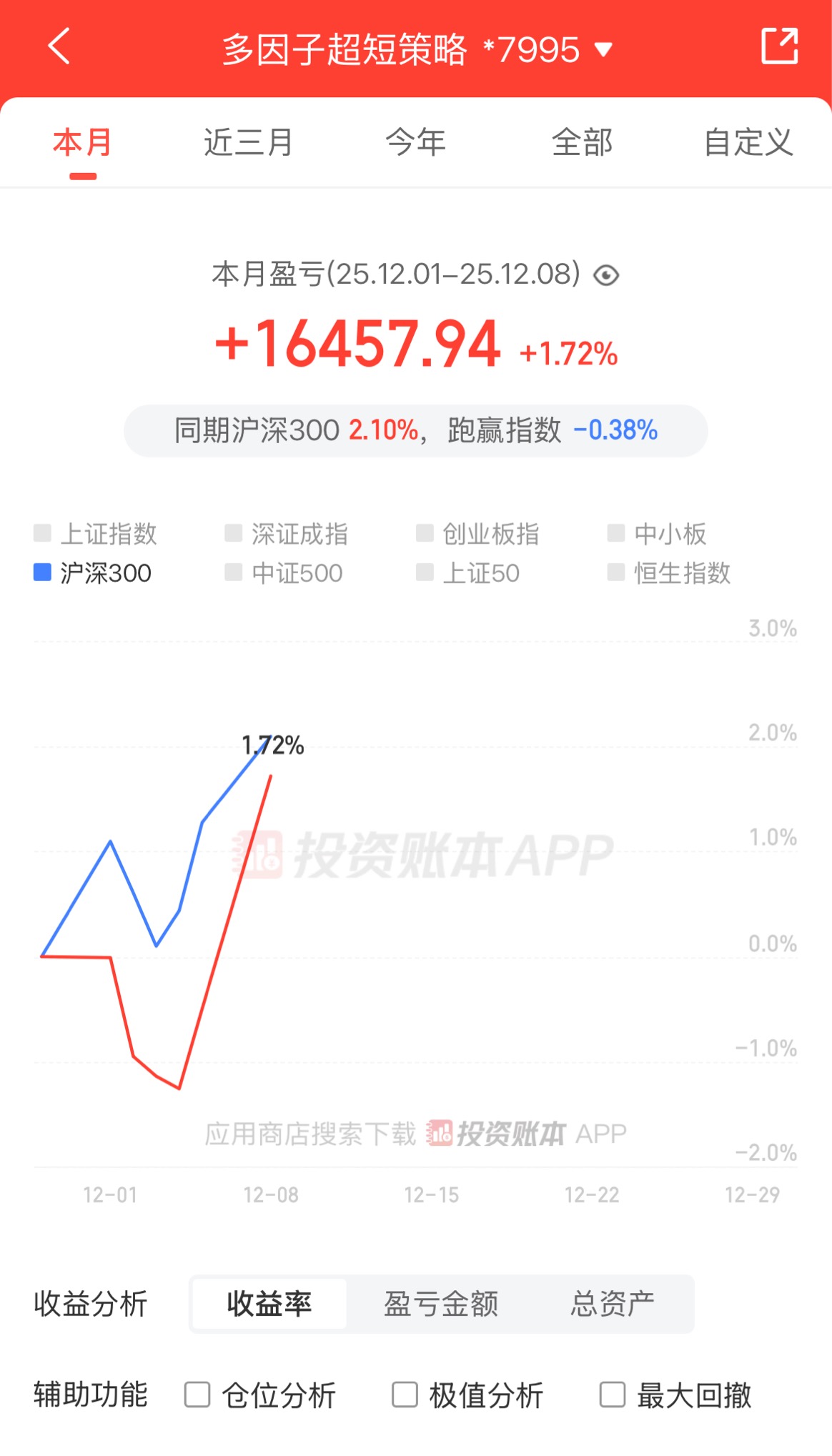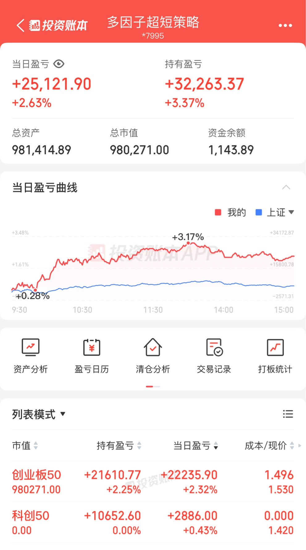 今日账户盈利:25122 元。 12月8日,截至收盘,上证指数涨0.54%,深证成指涨1.39%,创业板指涨2.6%,北证50涨1.27%。全市场成交额2.05万亿元,较上日成交额放量3126亿元。 ETF收盘涨跌不一,通信设备ETF(159583)领涨5.65%,创业板人工智能ETF华安(159279)涨5.62%,创业板人工智能ETF大成(159242)涨5.56%。巴西ETF(520870)领跌6.39%,巴西ETF(159100)跌6.37%,恒生消费ETF(159699)跌1.91%。