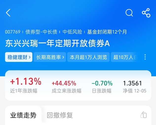 近期债市呈现持续回调态势,在我看来,当前低位布局的机会正逐步显现,从市场走势观察,债市大概率已接近企稳。我关注的$东兴兴瑞一年定开A$ 目前已开放申购,业绩表现稳健,近一年收益达1.13%,成立以来累计涨幅超44%,且每年均实现正收益,在当下市场环境中实属难得,个人对其后续表现较为看好。