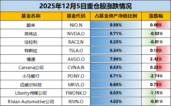【十大持仓】根据最新披露的基金定期报告,截至2025年三季度末,华宝海外新能源汽车前十大重仓股包括蔚来、英伟达、法拉利、博通、特斯拉、Carvana公司、小马智行、迈威尔科技、Liberty传媒公司、Rivian Automotive公司,占基金资产净值比例合计为75.42%。