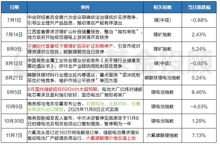 但是,正如我们在下表中所列的,对行情产生最显著积极影响的,还是储能需求超预期,而反内卷政策对股价影响较小、锂矿供给对股价产生的影响较为短暂。
