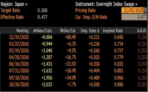 本次日元汇率并未遭受央行强行管控,而截止12月5日,市场对日央行在12月19日加息的预期已经达到89.5%。日元汇率从低点升值达1.5%左右,日经225指数仍然处于历史高点附近。