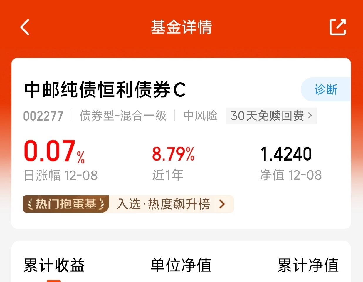 #观点搭子团火热招募中!# 混债也是可以抄底了,这不是这个$中邮纯债恒利债券C$ 今天收获了7个鸡蛋,主投可转债和纯债,没有股票