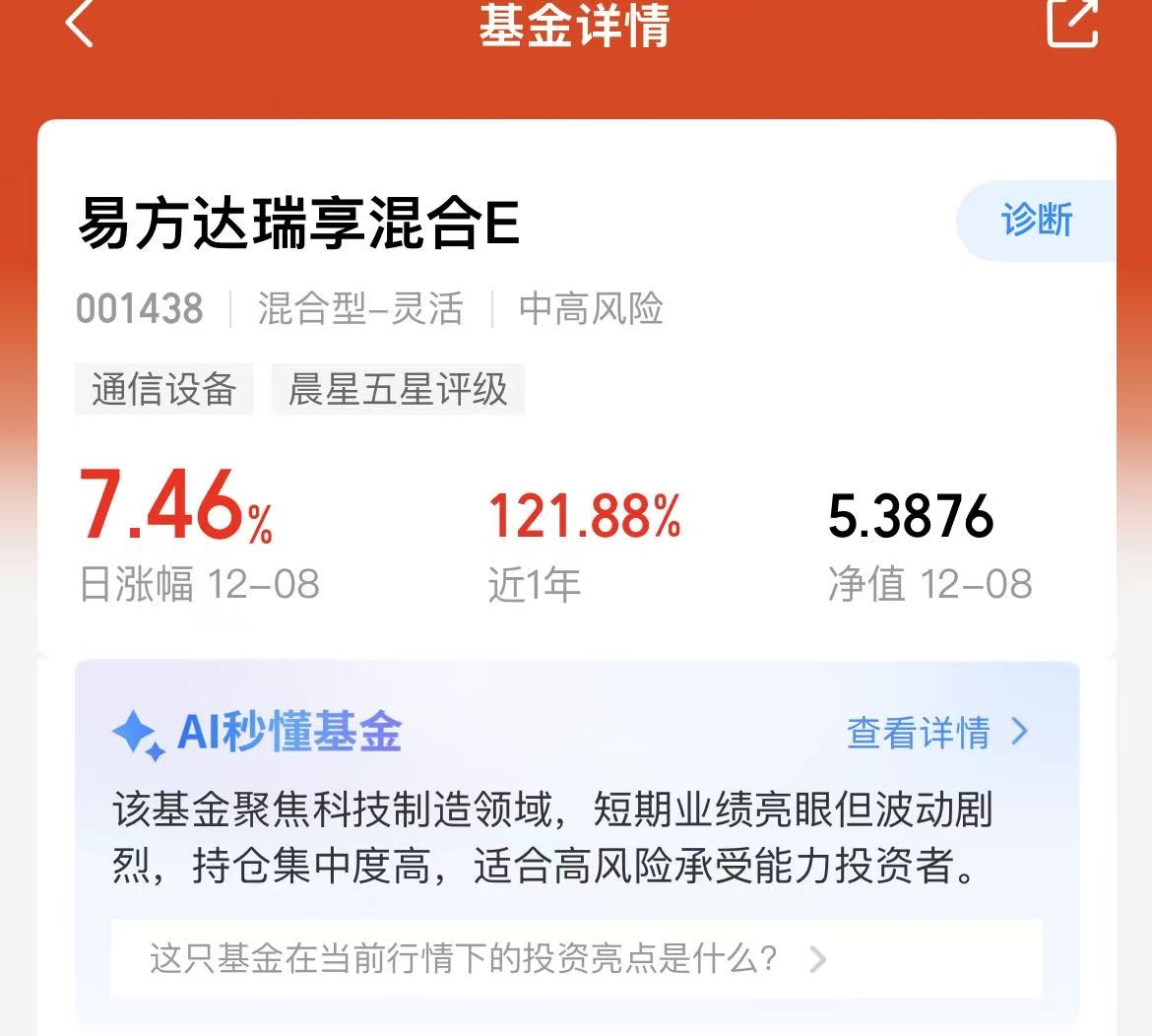 今天A股低开拉升,目前已经慢慢拉升了,CPO板块近期涨幅优秀,今天又继续上涨了,眼下,国内外算力基建“军备竞赛”,CPO需求持续增加。$易方达瑞享混合E(OTCFUND|001438)$以CPO为主攻方向,重仓中际旭创、新易盛等全球光模块龙头,同时布局光芯片、光器件等产业链关键环节,基金经理武阳10年投研生涯战绩辉煌,今天估值继续上涨3.3%,又可以坐等吃肉了,我也打算择机布局起来。$国泰中证全指通信设备ETF联接A(OTCFUND|007817)$#12月基金投资策略#
