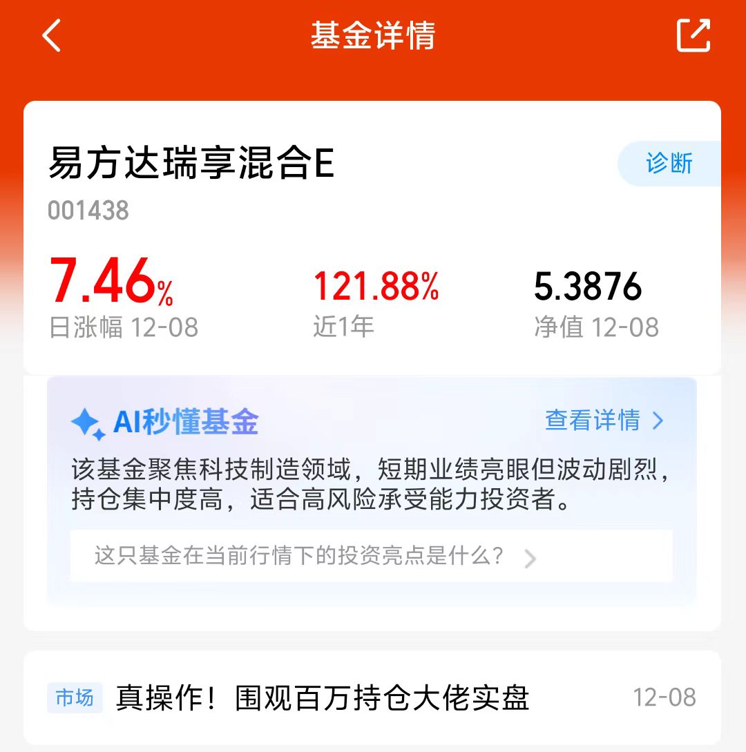 大盘今天震荡调整,板块今天有分化,CPO板块太给力了,今天继续上涨!易方达瑞享混合E昨天大涨7.46%,目前预估战鼓2.57%,经理调仓能力不错,成立10年里紧密把控成长机遇!近一年涨了121.88%,成立以来涨幅超400%,优于同类产品,看好这个方向,我准备分批布局!