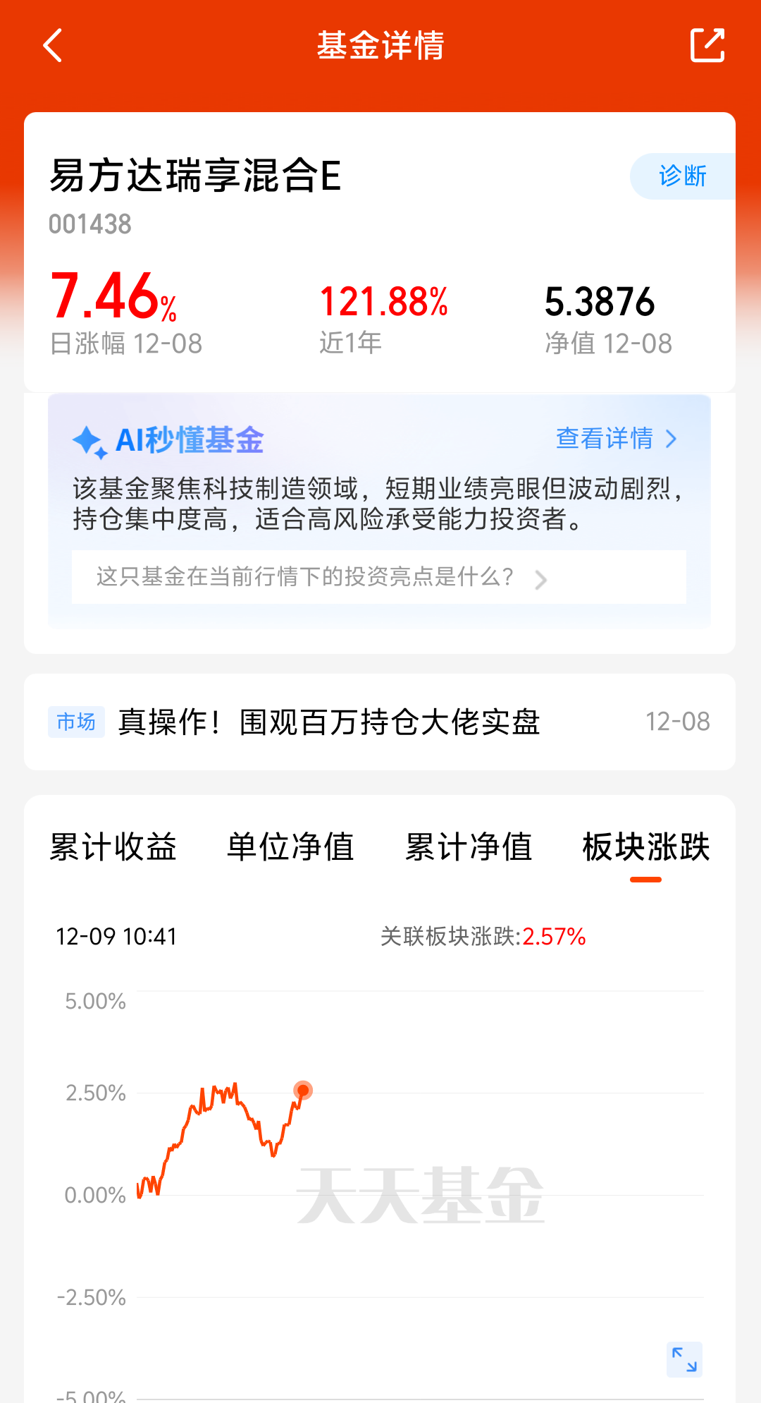 大盘今天震荡调整,CPO板块近期开始反弹上涨,今天表现还不错,继续上涨,易方达瑞享混合E昨天大涨7.46%,今天预估涨2.57%,近一年涨了121.88%,成立以来涨幅超400%,经理调仓能力不错,近期市场波动比较大,相信经理全市场配置能力,我准备分批加仓了!