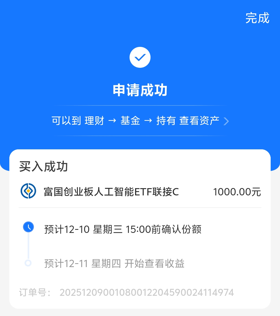 最近全球科技圈的热点,绕不开人工智能的持续演进。从算法的不断突破到算力的稳步提升,每个环节都能看到实打实的进步,国内相关企业也在紧跟这波浪潮。今天我买了1000元$富国创业板人工智能ETF发起式联接C$ 行业发展难免有涨有跌,但技术创新背后的长期潜力,让我觉得值得持续关注。这种基于核心技术的成长逻辑,不依赖短期炒作,反而让我对它的未来多了份踏实的期待。