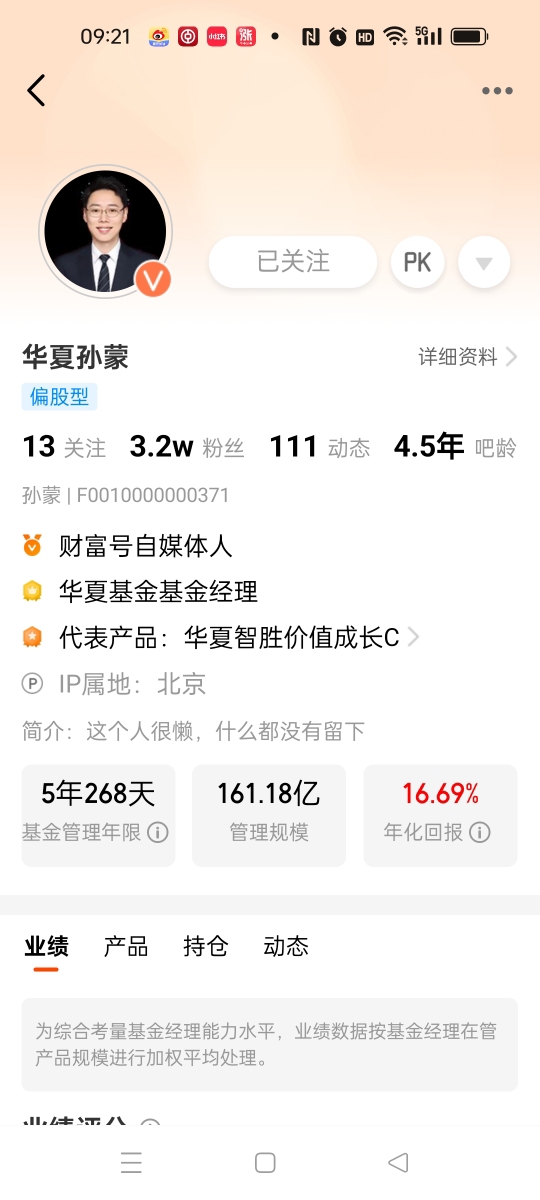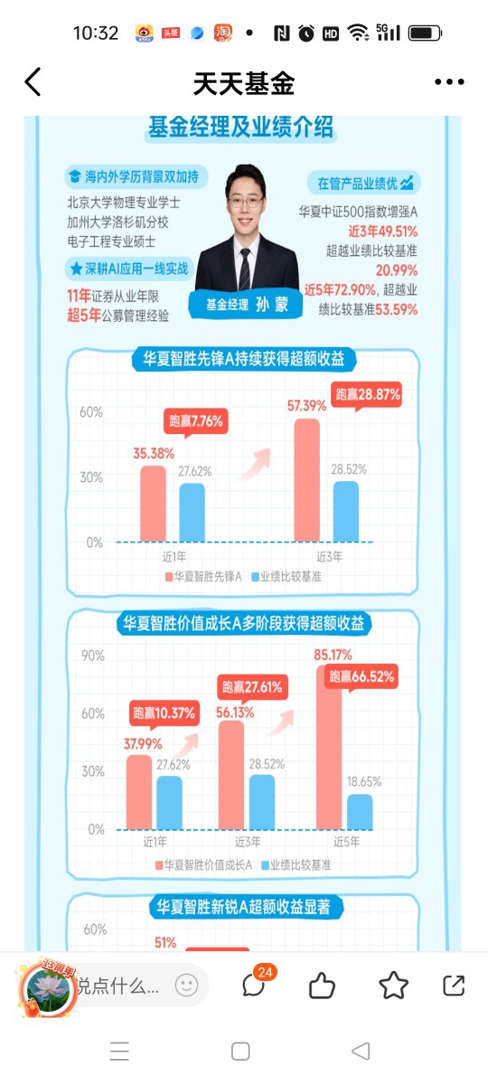 孙蒙经理孙目前管理的上面这几个基金,都是今年的牛基,并且业绩也是在显著提升,说明很多的投资者都是带着信任才把资金交给基金经理来打理的,那孙蒙经理也是把业绩做的很不错的,所以就有了任职5年又268天,任职回报有16.69%的成绩。他任职管理的$华夏智胜先锋股票C$,代码:014198,在3年又360天左右时间内,回报是54.60%,这个业绩也是非常的好。