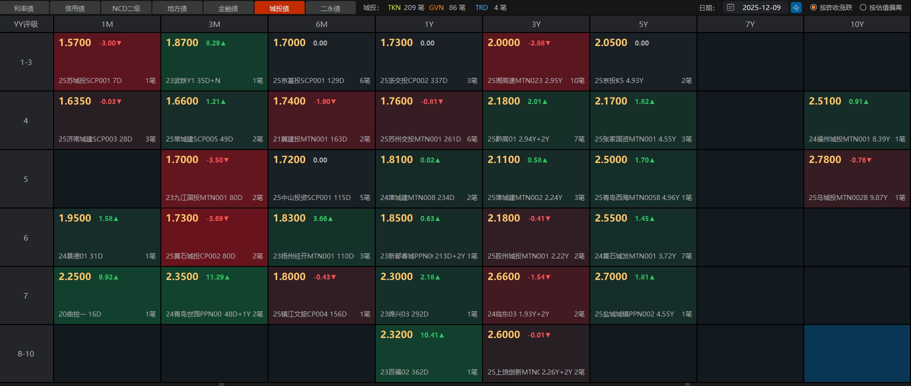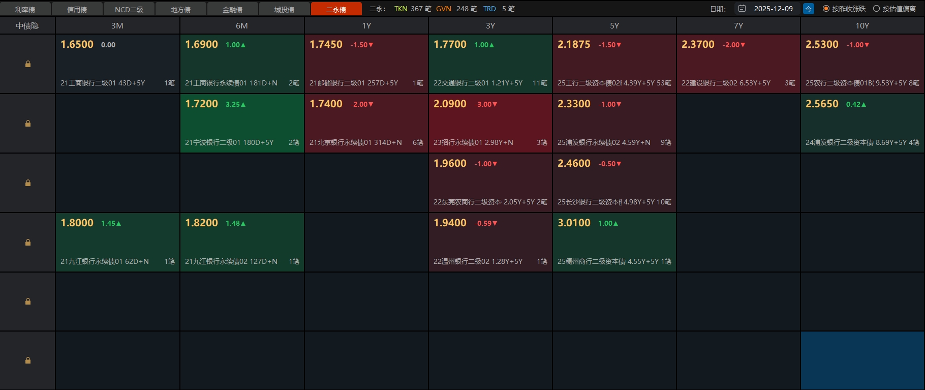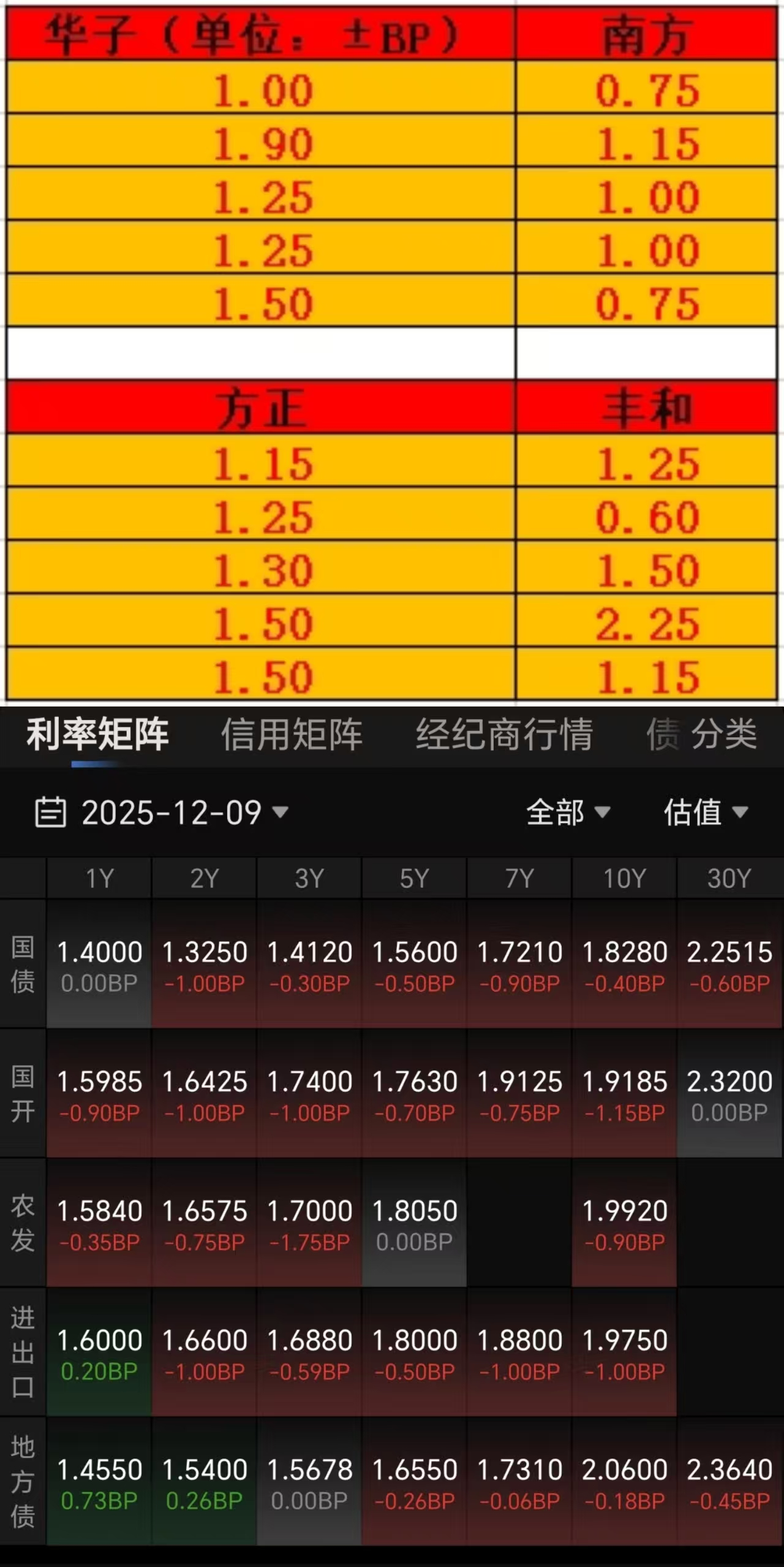 12月09日债市午间天气播报:上半场隔壁大盘震荡走弱,三千五百多家个股下跌,创业板指稍强。债市整体一般般吧,仅基金在买入,其余多在流出。目前7-10年国开债收6-9个蛋,超长期国债轻仓收蛋22-25个(华子),重仓26-32个蛋(方正、丰和);信用债里城投债偏弱,小部分碎0-1个蛋,银行债表现还行,多数收1-4个蛋,个别+利率长债有望收5个蛋。个人操作上,下午打算减一部分超长期国债,等回调后再低吸。