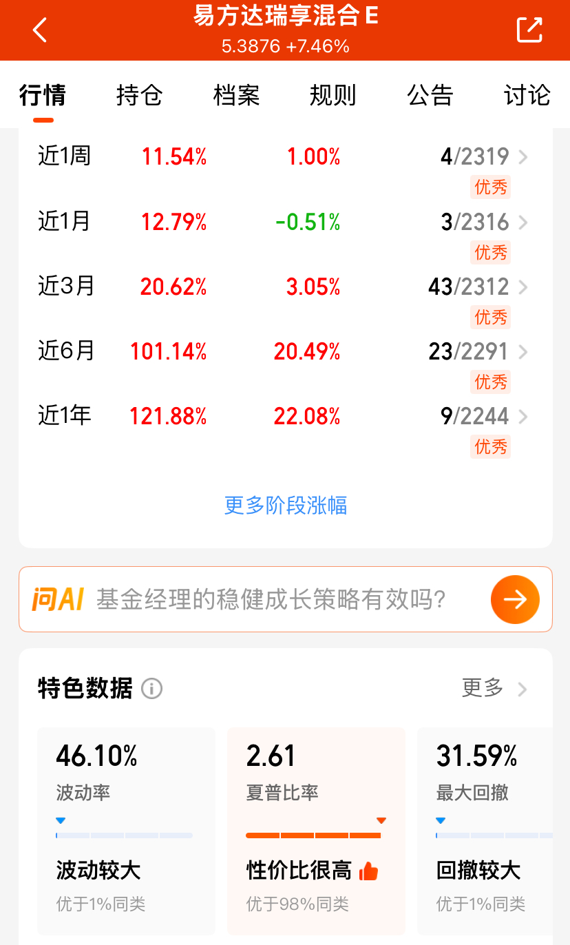 今天大盘呈现分化,指数整体涨跌不一,不过从盘中来看,CPO板块依旧坚挺,其中易方达瑞享,昨天收涨7.46%,年度涨超快122%,感觉经理能力出众,过往调仓效果不错,主打全市场配置,看好长期表现啦!$德邦鑫星价值灵活配置混合C(OTCFUND|002112)$#商业航天利好频出!如何把握投资机会?#