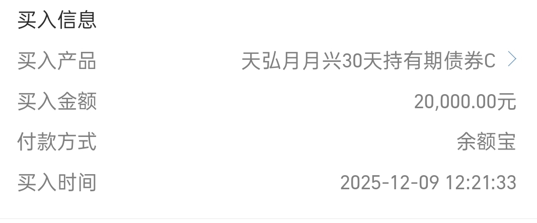 $天弘月月兴30天持有期债券C$ 大额上车2万,这是个低波动的纯债基金,波动和余额宝差不多,平时基本没什么起伏,但是收益却比余额宝好很多,近一年收益2.48%,确实很很香!而且回撤很小,几乎可以忽略不计!