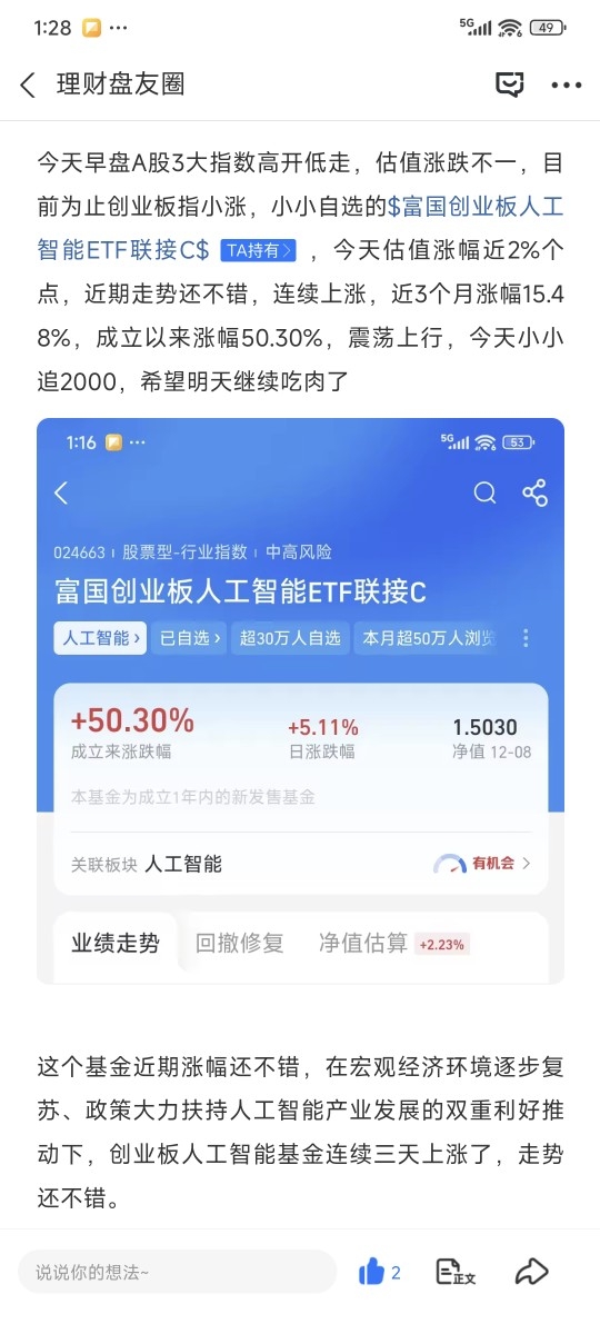 前为止创业板指小涨,小小自选的$富国创业板人工智能ETF发起式联接C$