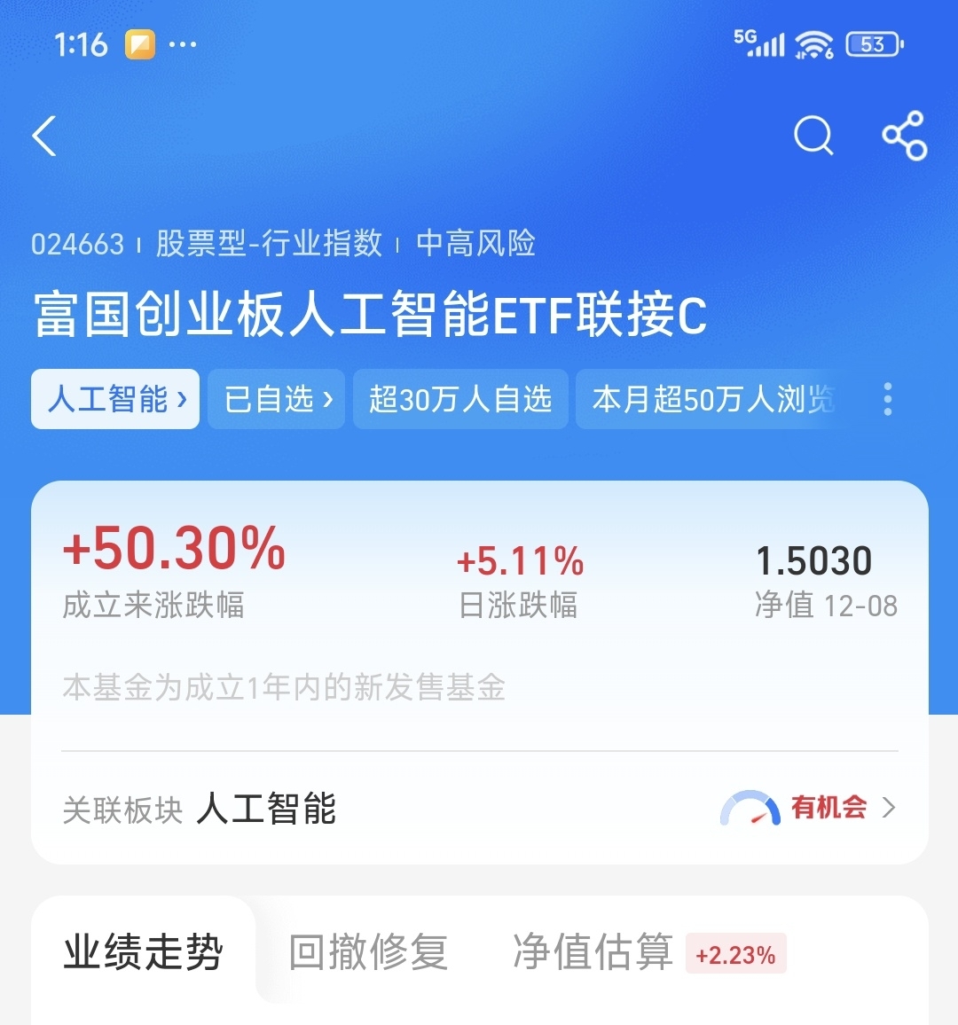 前为止创业板指小涨,小小自选的$富国创业板人工智能ETF发起式联接C$