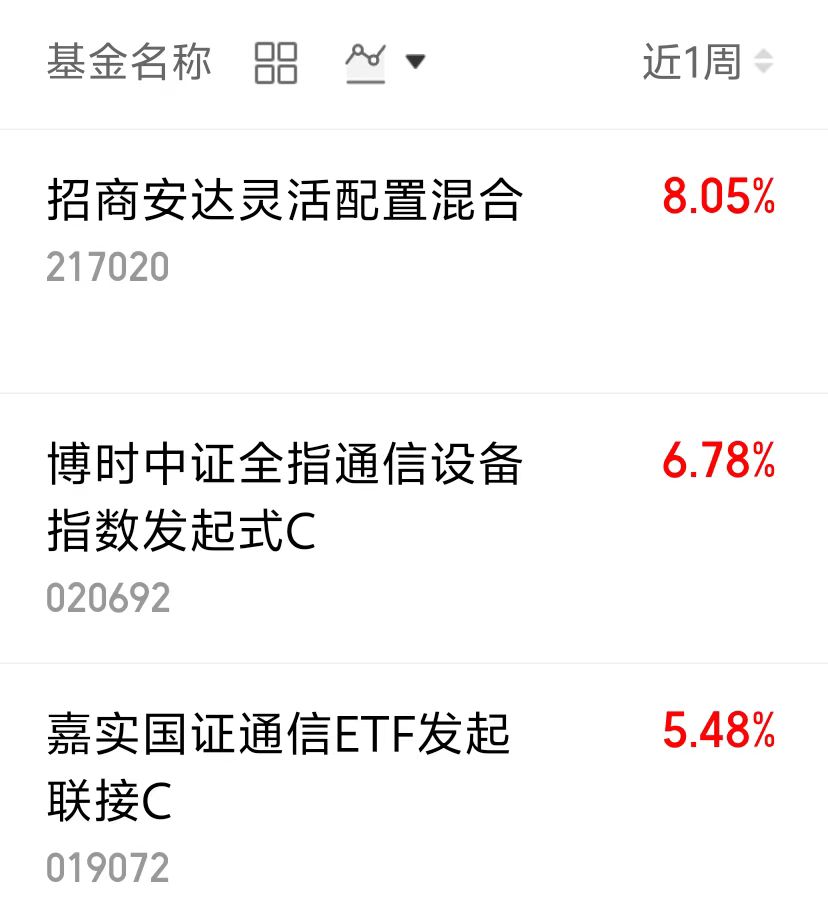大盘今天震荡调整,近期市场波动比较大,科技等板块轮动速度很快,通信板块近期表现还不错!$招商安达灵活配置混合(OTCFUND|217020)$近一周涨了8.05%