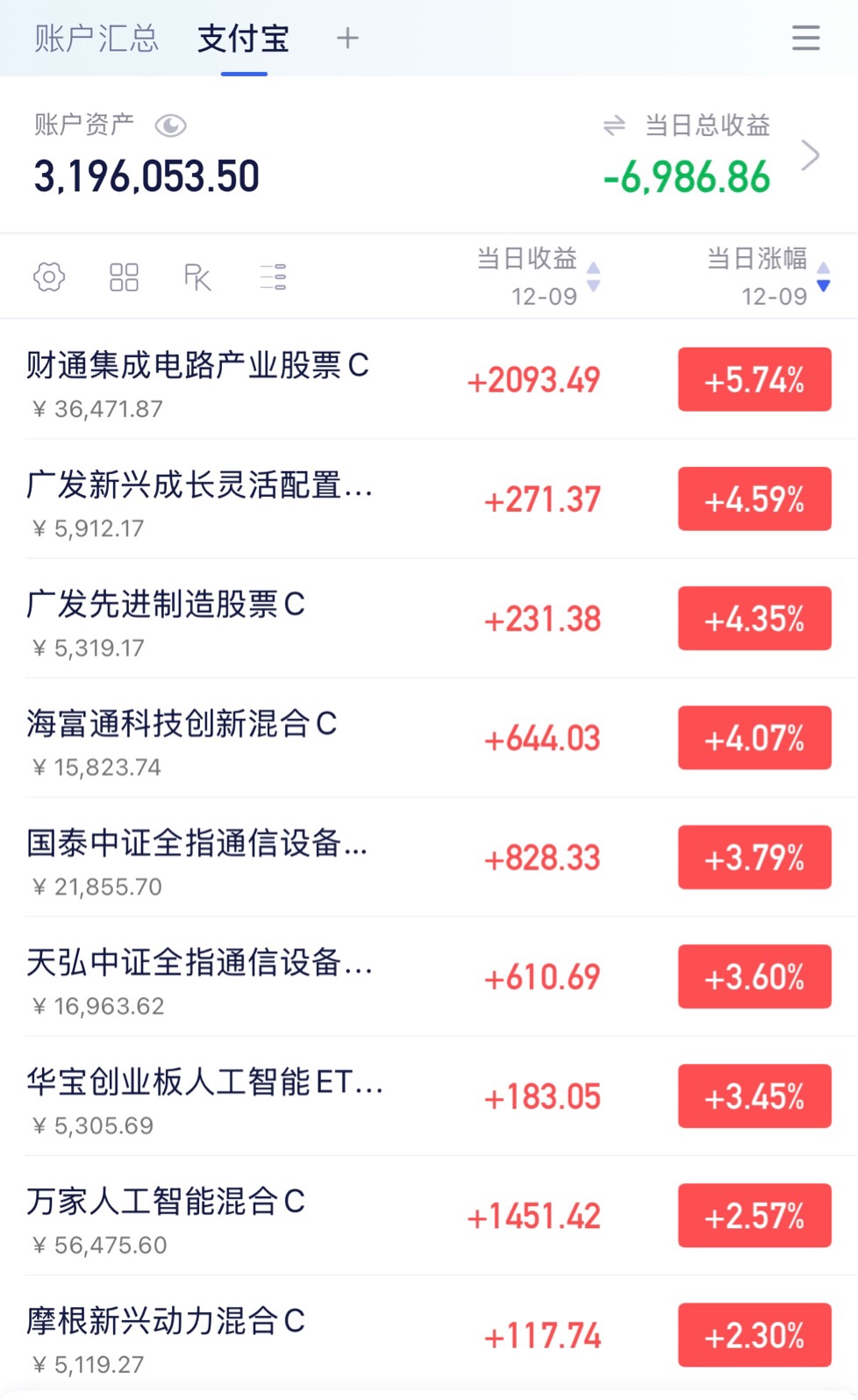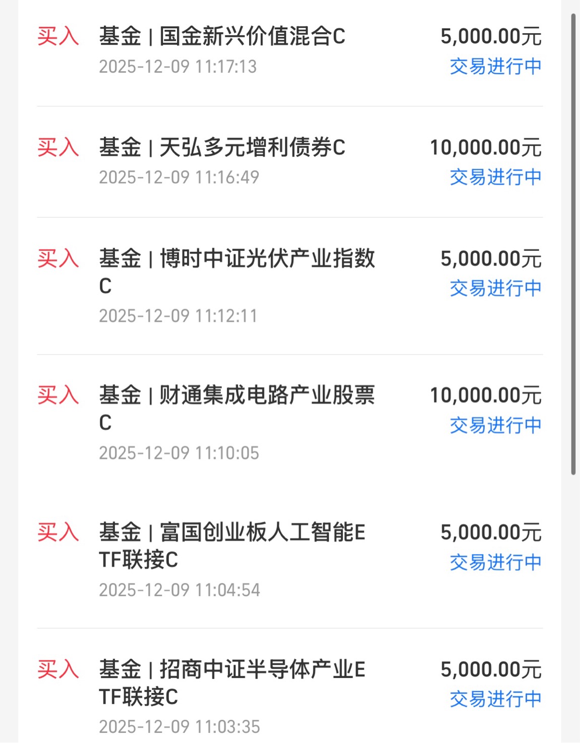 2. CPO主题,加仓10000,$财通集成电路产业股票C$ 昨天CPO平均上涨的5%,今天主题基金上涨了2%,两天上涨7%,主力资金卷土重来,重新流入CPO,强者恒强的逻辑没有改变,趁着反弹才刚刚开始,个人今天准备追加一次