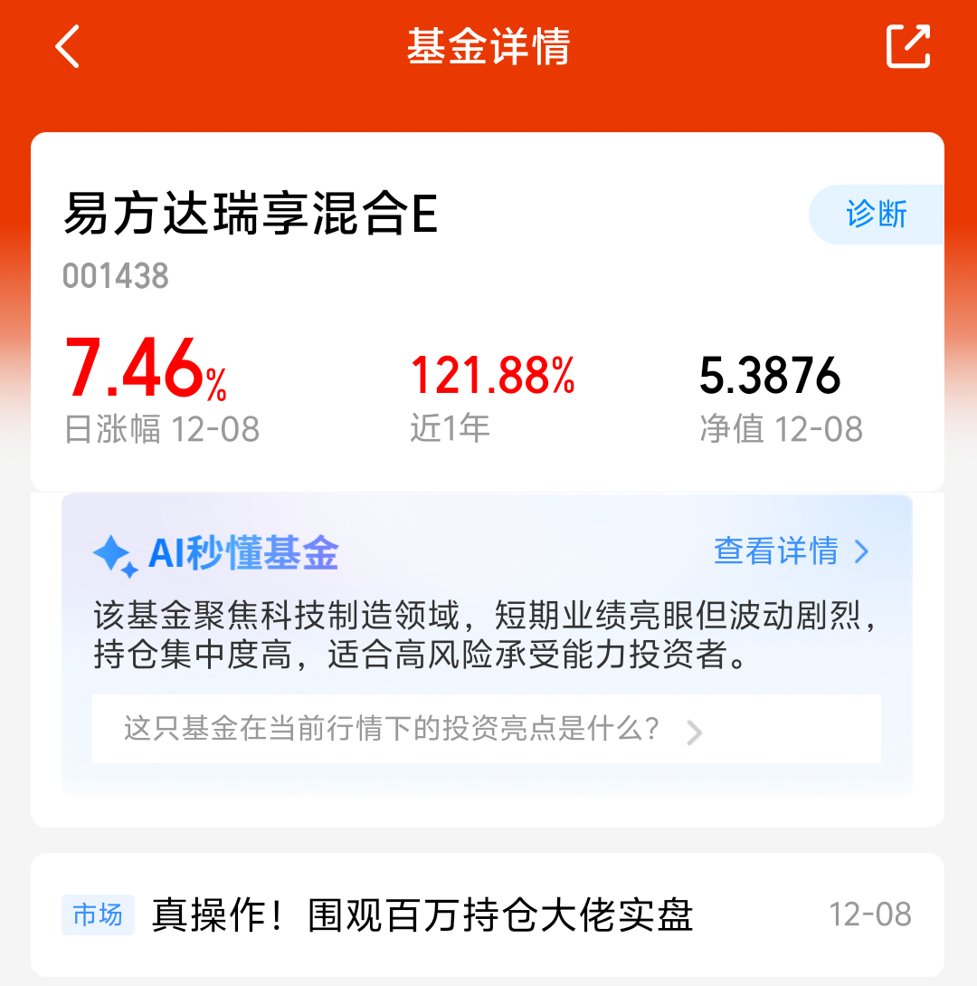 大盘近期波动比较大,今天震荡调整,科技等板块轮动速度很快,CPO、通信设备等今天继续上涨!易方达瑞享混合E昨天大涨7.46%,近一年涨了121.88%,业绩还不错,优于同类产品,经理调仓能力不错,全市场配置,长期看好这个方向,我准备分批布局!