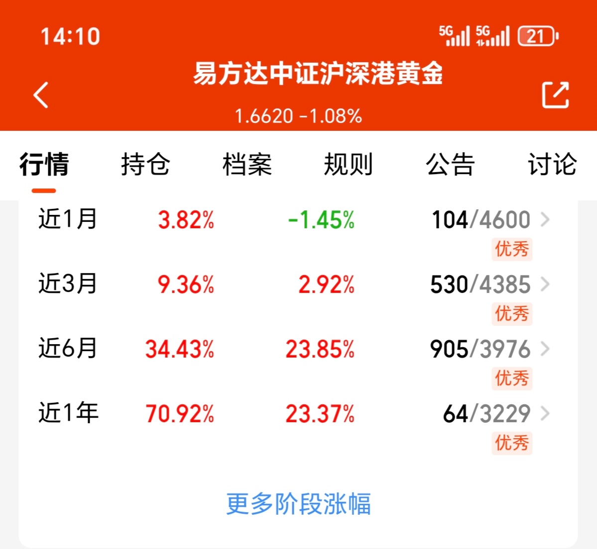 今日黄金赛道虽然出现波动,但从长期趋势来看仍然向好,所以我选择逢低定投,而黄金股明显比黄金板块韧性更高,所以上涨弹性空间会更强,其中$易方达中证沪深港黄金产业股票指数发起式C(OTCFUND|021363)$近一年涨超70.92%,业绩远超同类平均23.37%,各个阶段业绩都排名优秀,我也准备慢慢定投了!